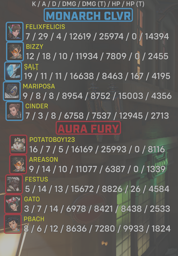 10 entries| Team | Player | Kills | Assists | Deaths | Damage | Damage (Taken) | Healing | Healing (Taken) |