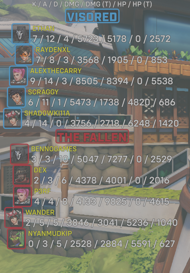 10 entries| Team | Player | Kills | Assists | Deaths | Damage | Damage (Taken) | Healing | Healing (Taken) |