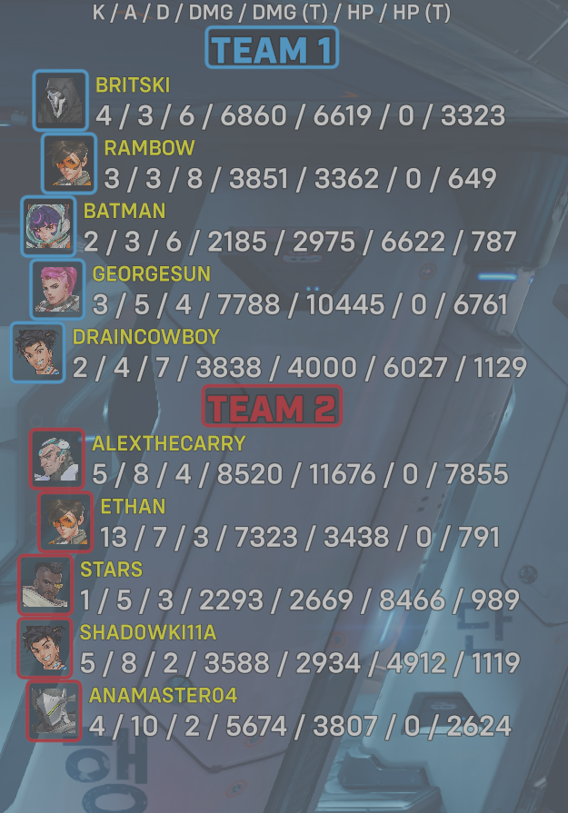 10 entries| Team | Player | Kills | Assists | Deaths | Damage | Damage (Taken) | Healing | Healing (Taken) |