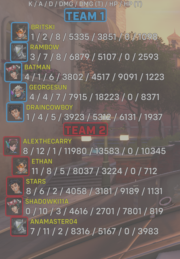 10 entries| Team | Player | Kills | Assists | Deaths | Damage | Damage (Taken) | Healing | Healing (Taken) |