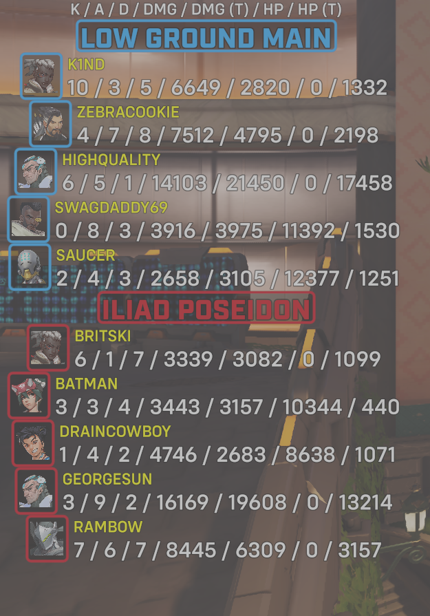 10 entries| Team | Player | Kills | Assists | Deaths | Damage | Damage (Taken) | Healing | Healing (Taken) |
