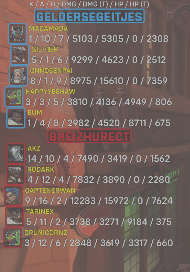 10 entries| Team | Player | Kills | Assists | Deaths | Damage | Damage (Taken) | Healing | Healing (Taken) |