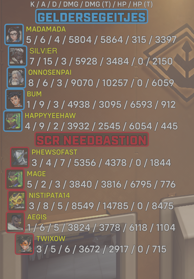 10 entries| Team | Player | Kills | Assists | Deaths | Damage | Damage (Taken) | Healing | Healing (Taken) |