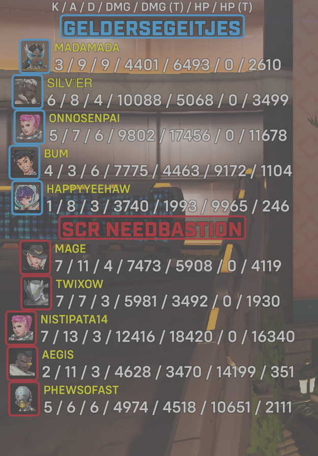 10 entries| Team | Player | Kills | Assists | Deaths | Damage | Damage (Taken) | Healing | Healing (Taken) |