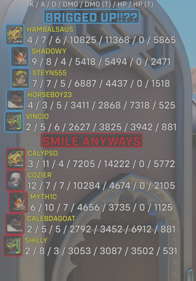 10 entries| Team | Player | Kills | Assists | Deaths | Damage | Damage (Taken) | Healing | Healing (Taken) |