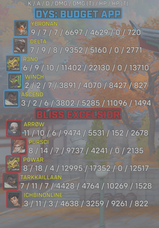 10 entries| Team | Player | Kills | Assists | Deaths | Damage | Damage (Taken) | Healing | Healing (Taken) |