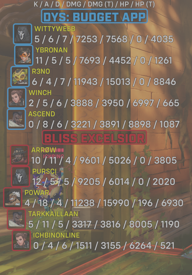 10 entries| Team | Player | Kills | Assists | Deaths | Damage | Damage (Taken) | Healing | Healing (Taken) |