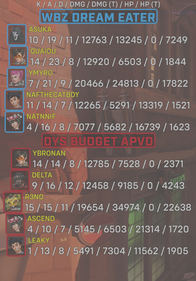 10 entries| Team | Player | Kills | Assists | Deaths | Damage | Damage (Taken) | Healing | Healing (Taken) |