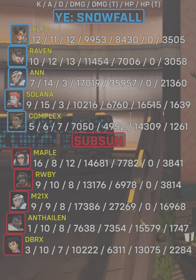 10 entries| Team | Player | Kills | Assists | Deaths | Damage | Damage (Taken) | Healing | Healing (Taken) |