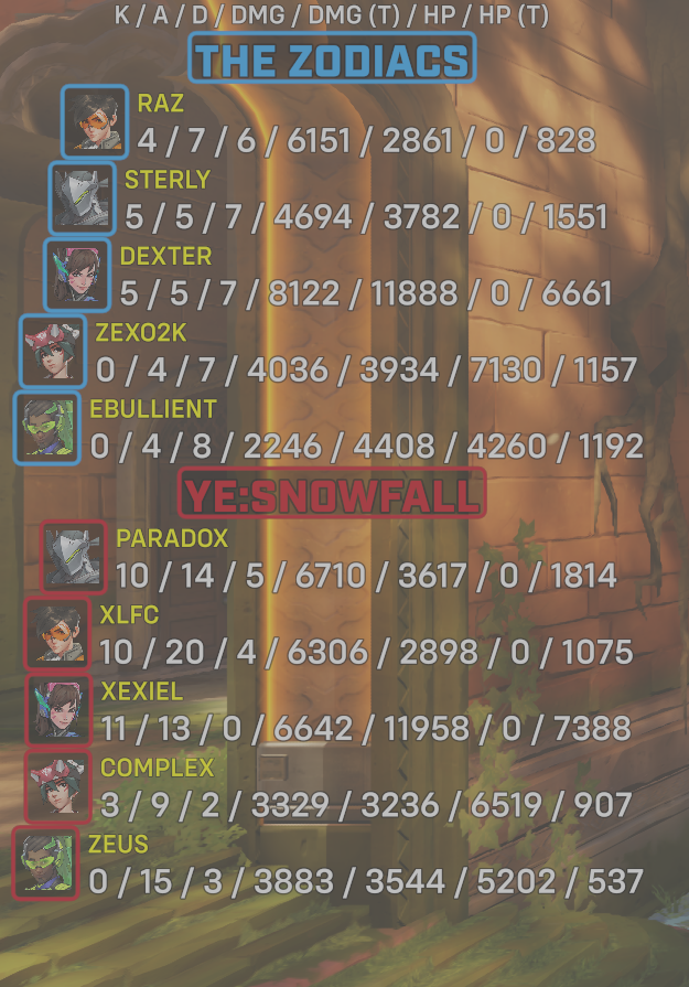 10 entries| Team | Player | Kills | Assists | Deaths | Damage | Damage (Taken) | Healing | Healing (Taken) |