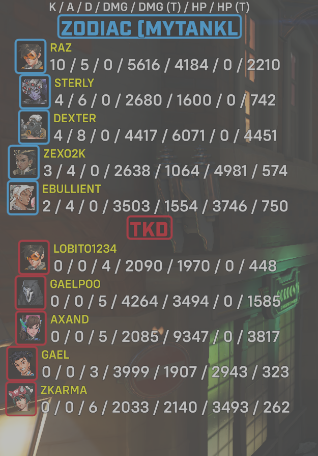 10 entries| Team | Player | Kills | Assists | Deaths | Damage | Damage (Taken) | Healing | Healing (Taken) |