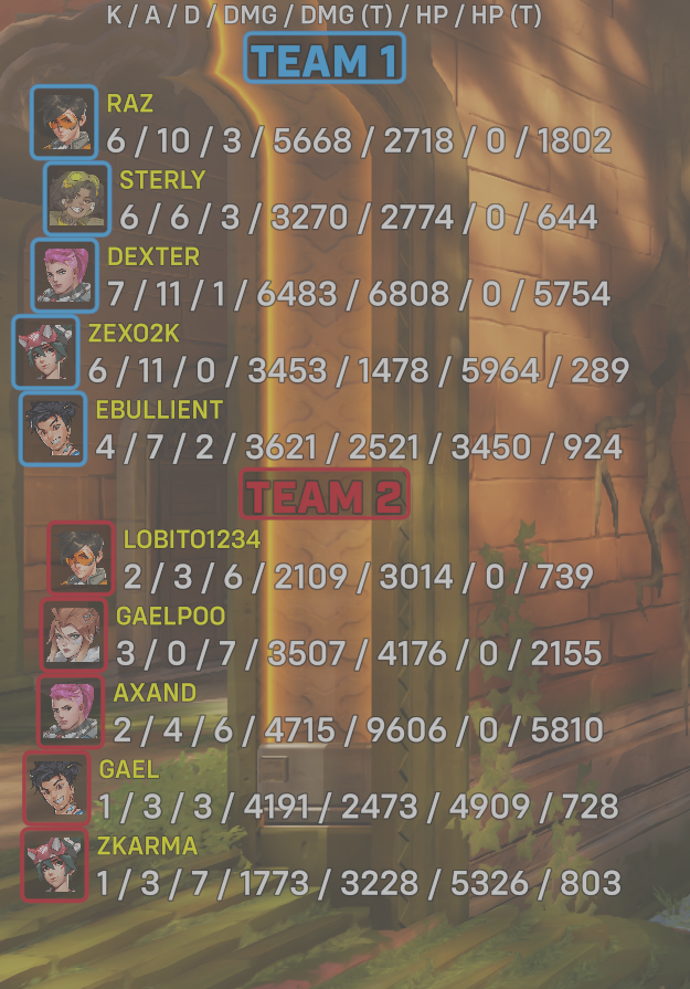 10 entries| Team | Player | Kills | Assists | Deaths | Damage | Damage (Taken) | Healing | Healing (Taken) |