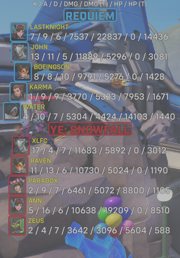 10 entries| Team | Player | Kills | Assists | Deaths | Damage | Damage (Taken) | Healing | Healing (Taken) |
