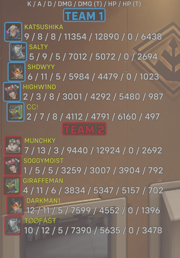 10 entries| Team | Player | Kills | Assists | Deaths | Damage | Damage (Taken) | Healing | Healing (Taken) |