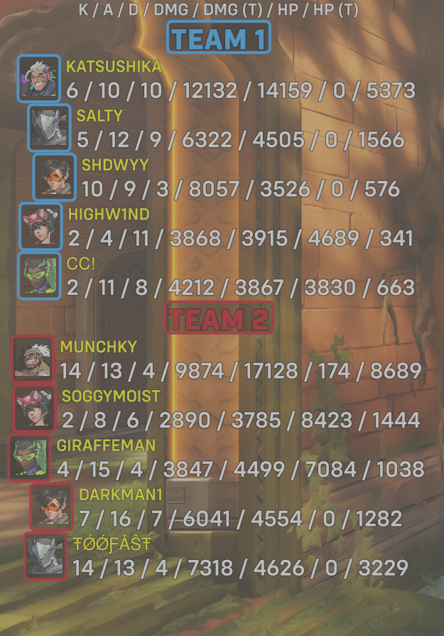 10 entries| Team | Player | Kills | Assists | Deaths | Damage | Damage (Taken) | Healing | Healing (Taken) |