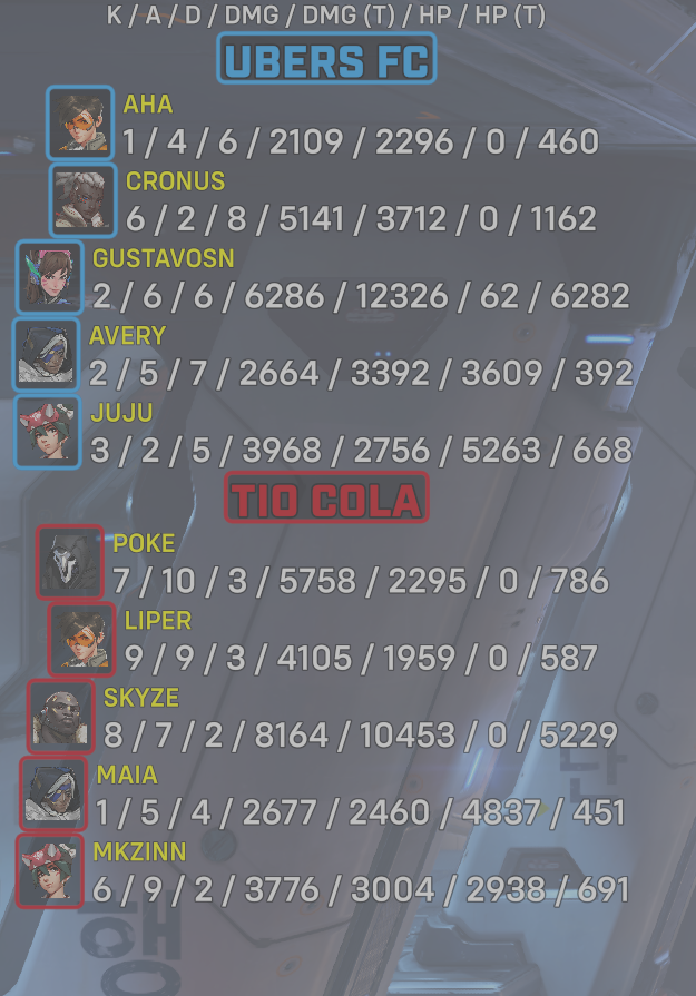 10 entries| Team | Player | Kills | Assists | Deaths | Damage | Damage (Taken) | Healing | Healing (Taken) |