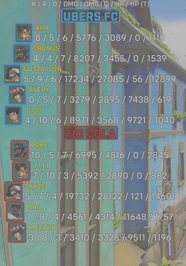 10 entries| Team | Player | Kills | Assists | Deaths | Damage | Damage (Taken) | Healing | Healing (Taken) |