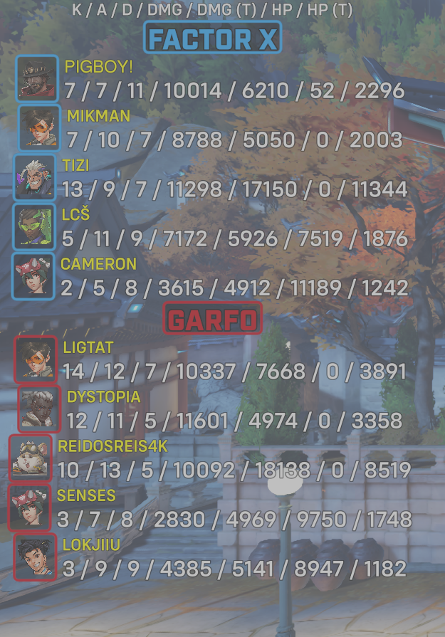 10 entries| Team | Player | Kills | Assists | Deaths | Damage | Damage (Taken) | Healing | Healing (Taken) |