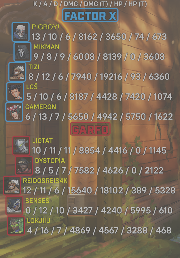 10 entries| Team | Player | Kills | Assists | Deaths | Damage | Damage (Taken) | Healing | Healing (Taken) |
