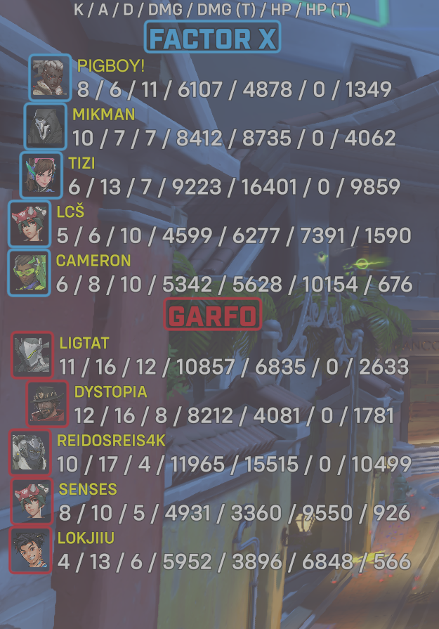 10 entries| Team | Player | Kills | Assists | Deaths | Damage | Damage (Taken) | Healing | Healing (Taken) |