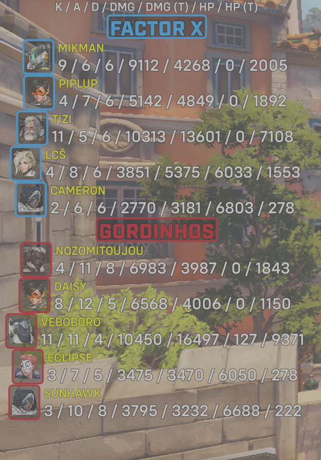 10 entries| Team | Player | Kills | Assists | Deaths | Damage | Damage (Taken) | Healing | Healing (Taken) |