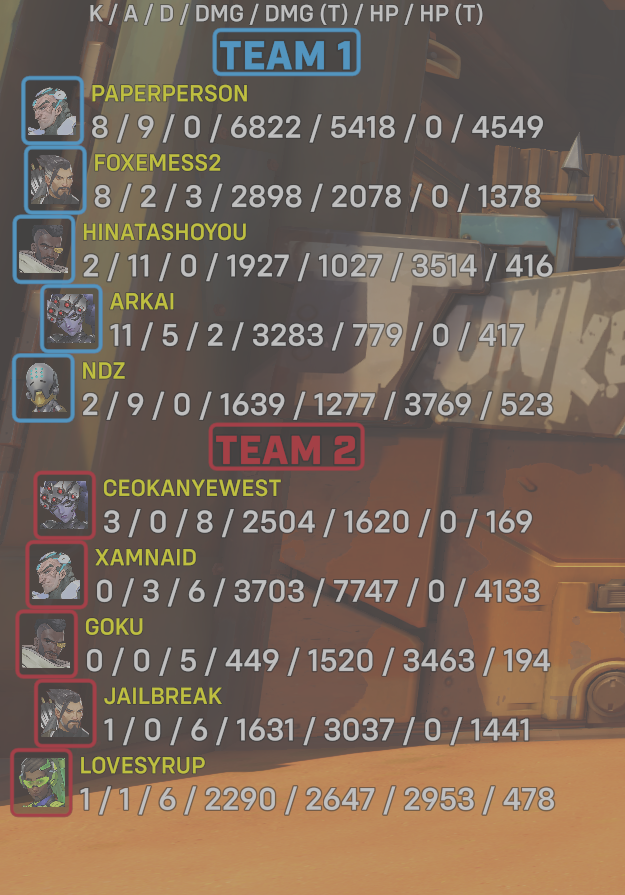 10 entries| Team | Player | Kills | Assists | Deaths | Damage | Damage (Taken) | Healing | Healing (Taken) |
