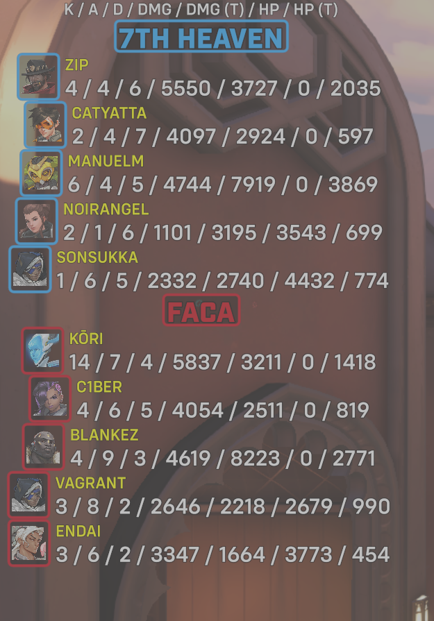 10 entries| Team | Player | Kills | Assists | Deaths | Damage | Damage (Taken) | Healing | Healing (Taken) |