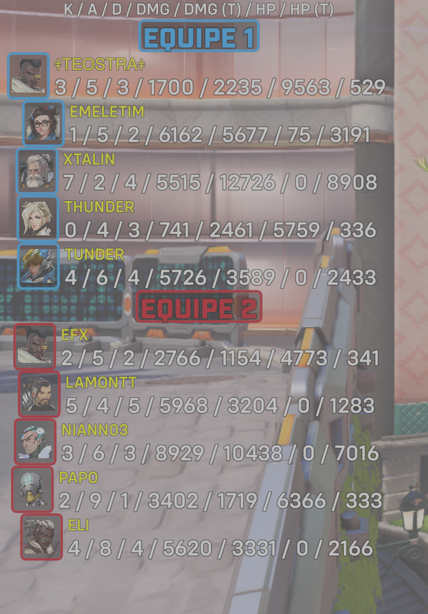 10 entries| Team | Player | Kills | Assists | Deaths | Damage | Damage (Taken) | Healing | Healing (Taken) |