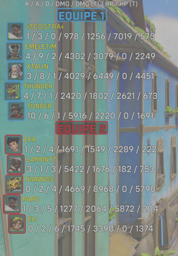 10 entries| Team | Player | Kills | Assists | Deaths | Damage | Damage (Taken) | Healing | Healing (Taken) |
