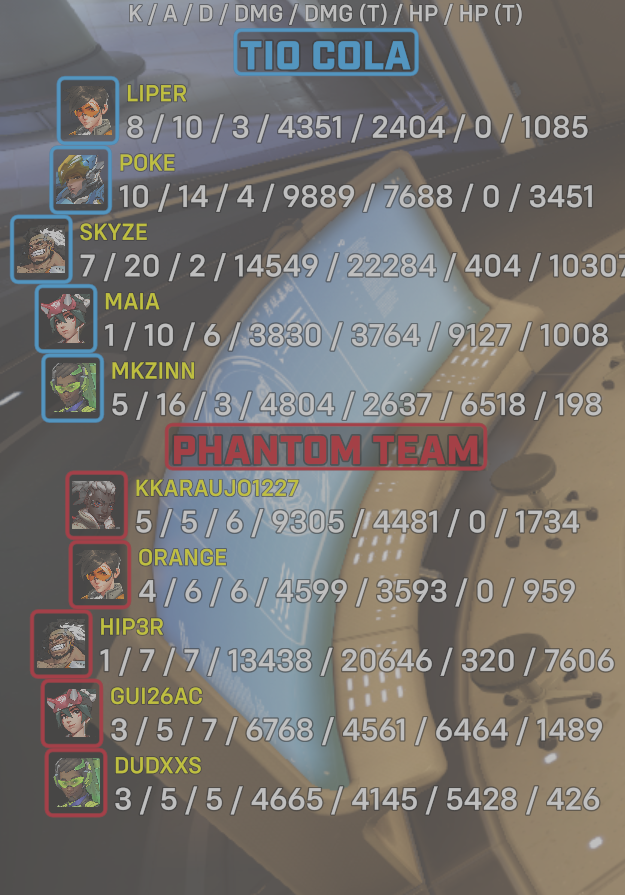 10 entries| Team | Player | Kills | Assists | Deaths | Damage | Damage (Taken) | Healing | Healing (Taken) |