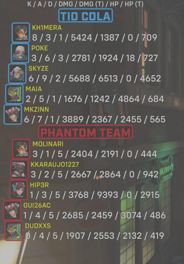 10 entries| Team | Player | Kills | Assists | Deaths | Damage | Damage (Taken) | Healing | Healing (Taken) |