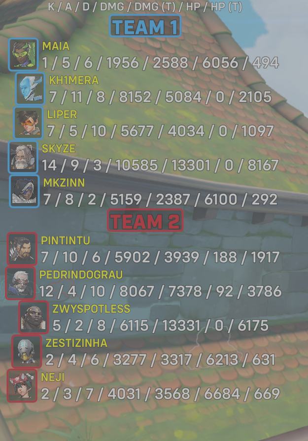 10 entries| Team | Player | Kills | Assists | Deaths | Damage | Damage (Taken) | Healing | Healing (Taken) |