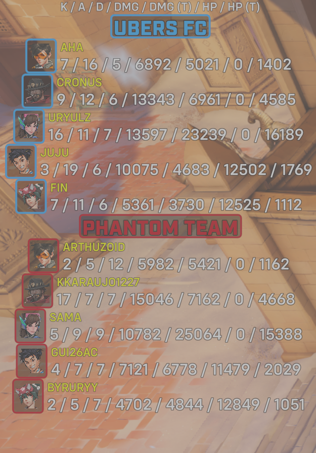 10 entries| Team | Player | Kills | Assists | Deaths | Damage | Damage (Taken) | Healing | Healing (Taken) |