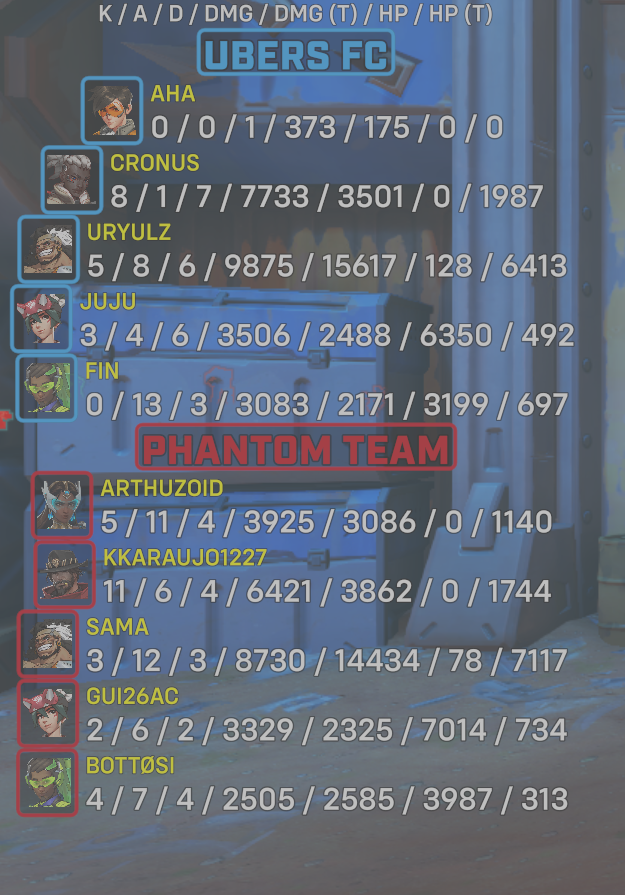 9 entries| Team | Player | Kills | Assists | Deaths | Damage | Damage (Taken) | Healing | Healing (Taken) |