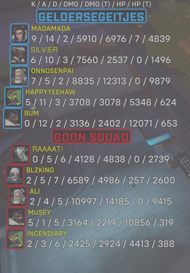 10 entries| Team | Player | Kills | Assists | Deaths | Damage | Damage (Taken) | Healing | Healing (Taken) |