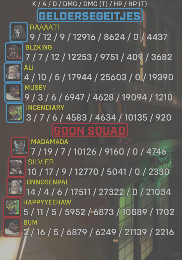10 entries| Team | Player | Kills | Assists | Deaths | Damage | Damage (Taken) | Healing | Healing (Taken) |