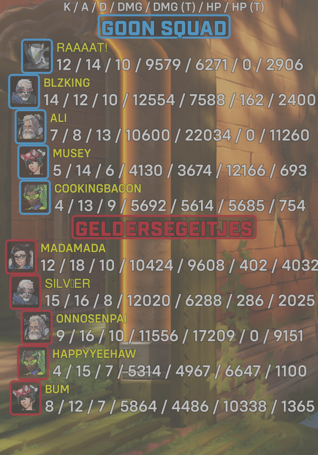 10 entries| Team | Player | Kills | Assists | Deaths | Damage | Damage (Taken) | Healing | Healing (Taken) |