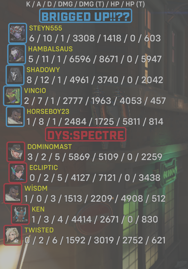 10 entries| Team | Player | Kills | Assists | Deaths | Damage | Damage (Taken) | Healing | Healing (Taken) |