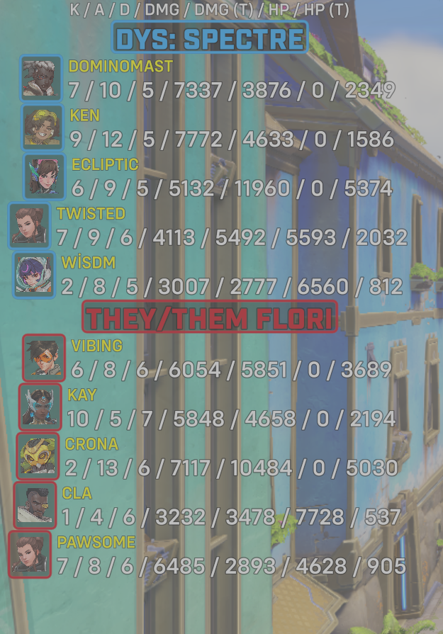 10 entries| Team | Player | Kills | Assists | Deaths | Damage | Damage (Taken) | Healing | Healing (Taken) |