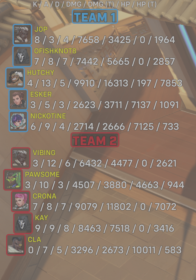 10 entries| Team | Player | Kills | Assists | Deaths | Damage | Damage (Taken) | Healing | Healing (Taken) |