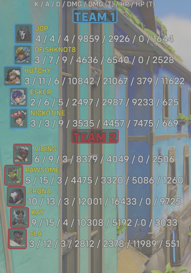 10 entries| Team | Player | Kills | Assists | Deaths | Damage | Damage (Taken) | Healing | Healing (Taken) |