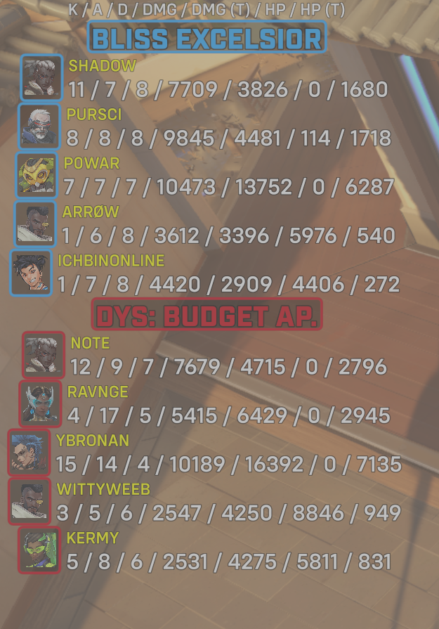 10 entries| Team | Player | Kills | Assists | Deaths | Damage | Damage (Taken) | Healing | Healing (Taken) |