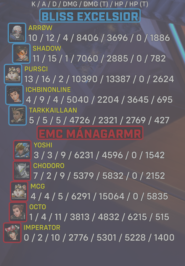 10 entries| Team | Player | Kills | Assists | Deaths | Damage | Damage (Taken) | Healing | Healing (Taken) |
