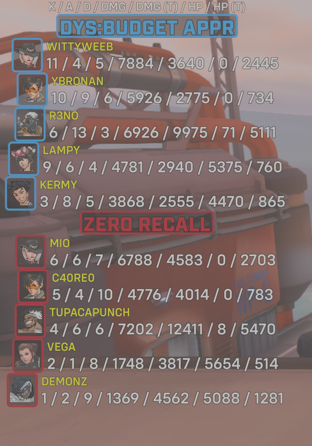 9 entries| Team | Player | Kills | Assists | Deaths | Damage | Damage (Taken) | Healing | Healing (Taken) |