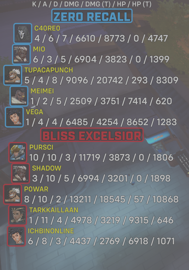 9 entries| Team | Player | Kills | Assists | Deaths | Damage | Damage (Taken) | Healing | Healing (Taken) |