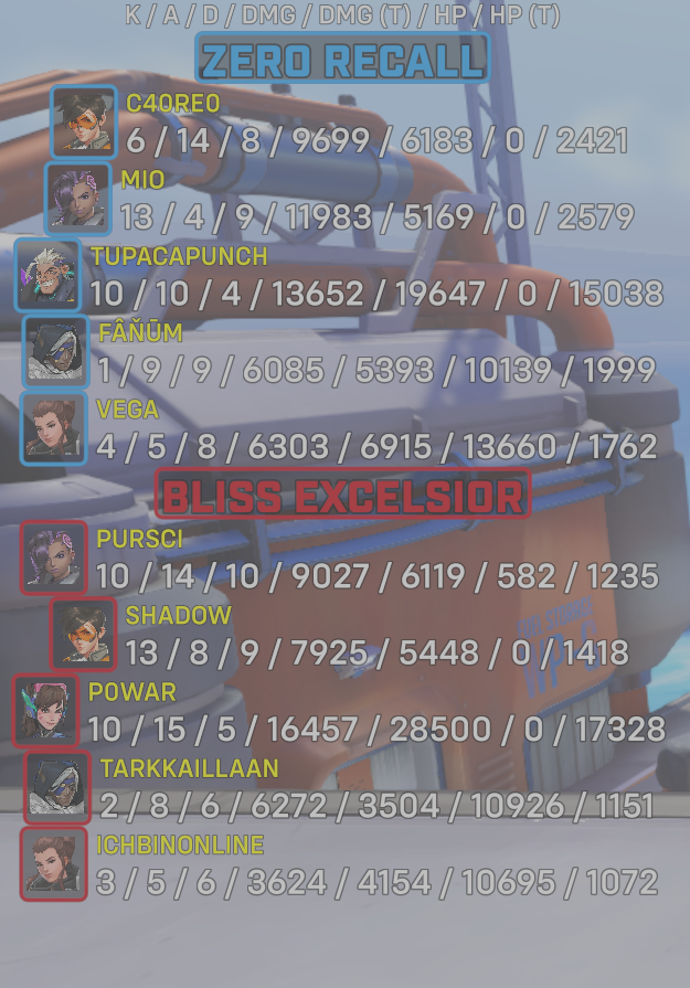 9 entries| Team | Player | Kills | Assists | Deaths | Damage | Damage (Taken) | Healing | Healing (Taken) |