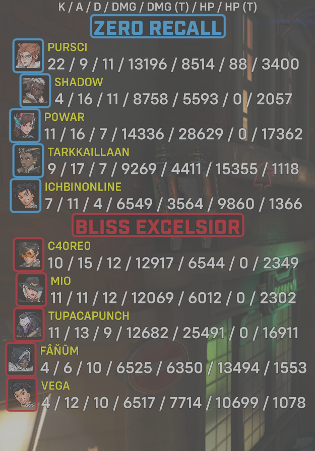 9 entries| Team | Player | Kills | Assists | Deaths | Damage | Damage (Taken) | Healing | Healing (Taken) |