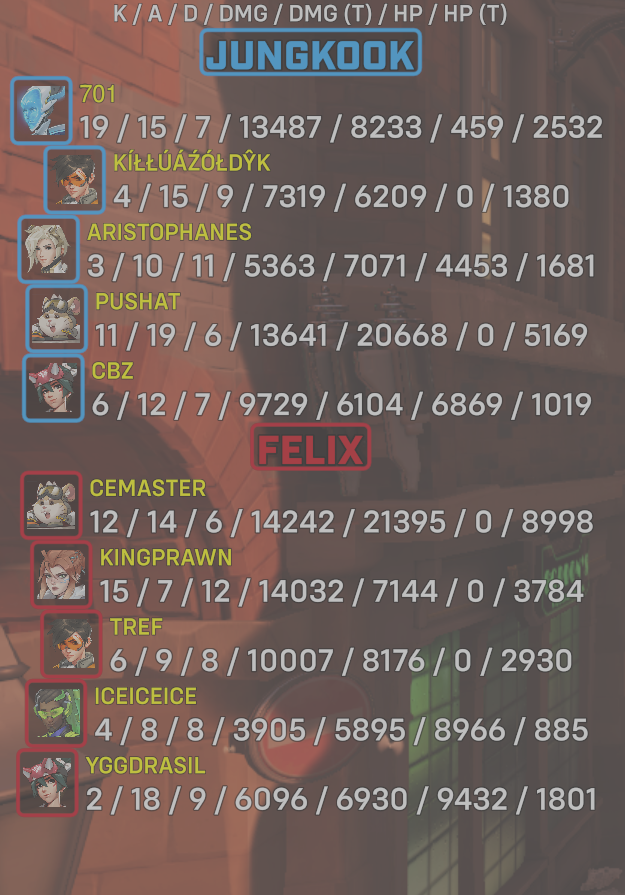 10 entries| Team | Player | Kills | Assists | Deaths | Damage | Damage (Taken) | Healing | Healing (Taken) |