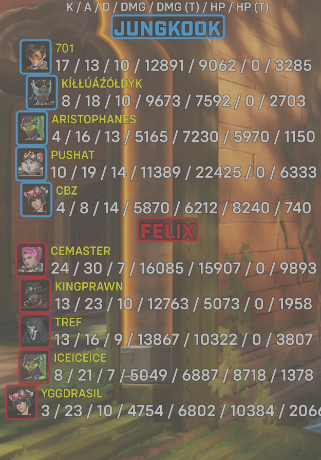 10 entries| Team | Player | Kills | Assists | Deaths | Damage | Damage (Taken) | Healing | Healing (Taken) |