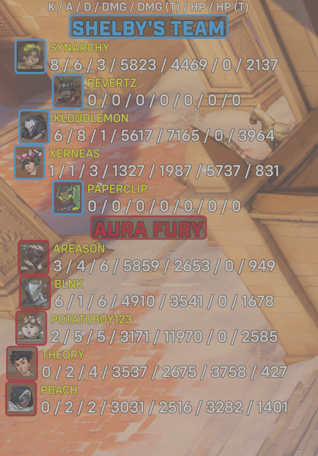 10 entries| Team | Player | Kills | Assists | Deaths | Damage | Damage (Taken) | Healing | Healing (Taken) |